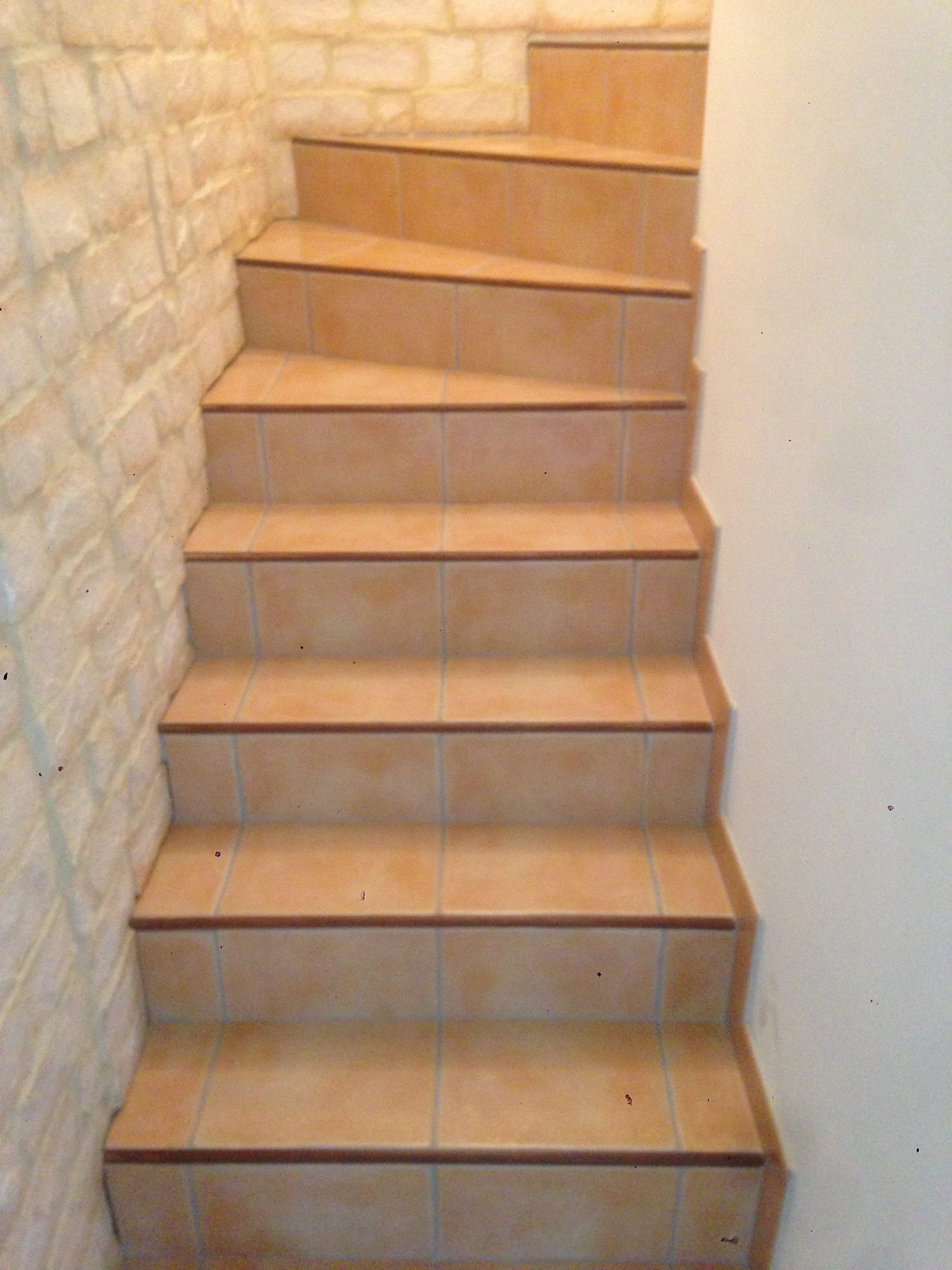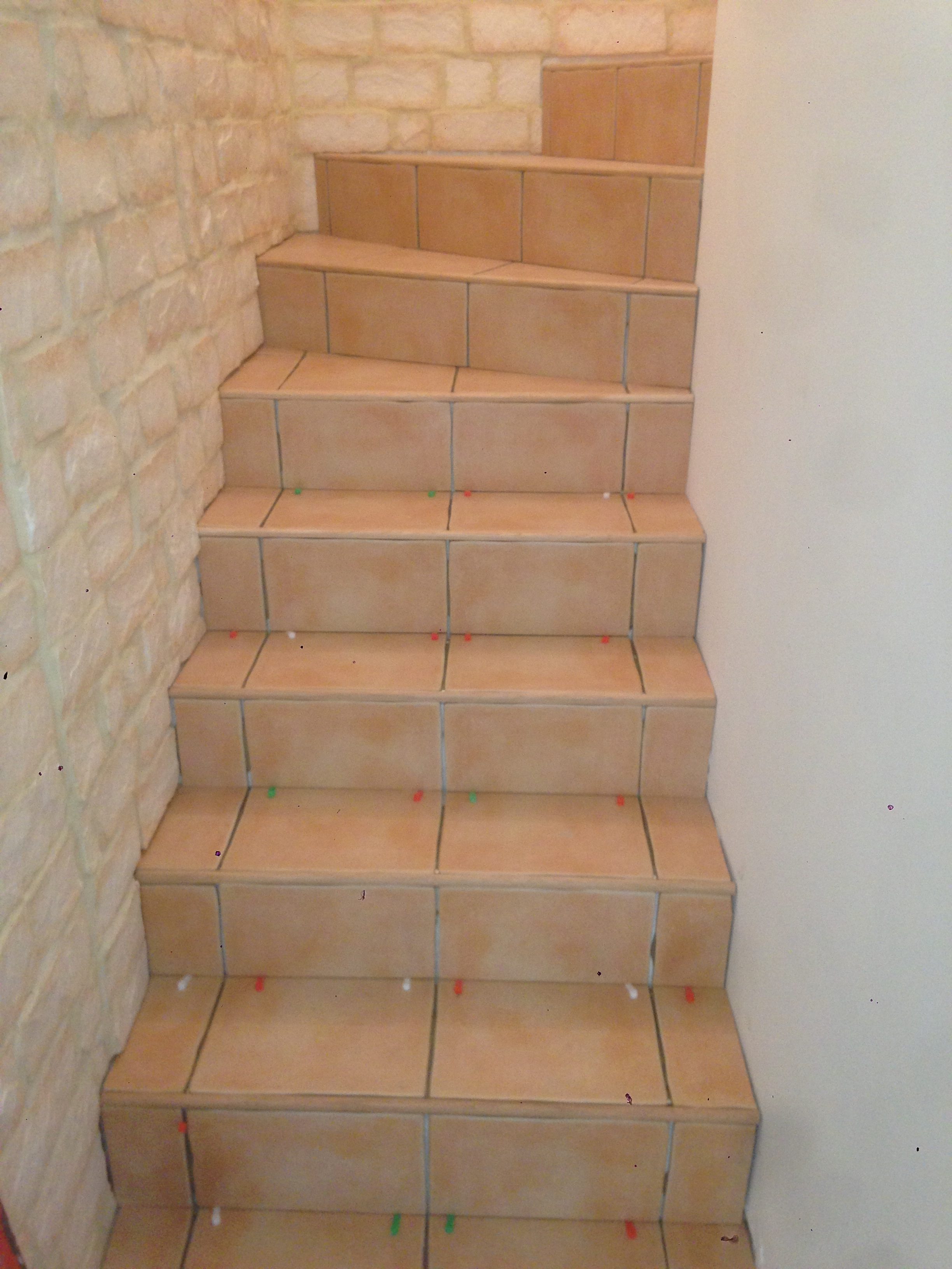 Description : Bien souvent les pièces les plus exiguës demandent une attention particulière dans le choix du carrelage et du calepinage.  L’implantation se cale sur l’axe des marches, les coupes se répartissent de manière uniforme à gauche et à droite. Un résultat harmonieux et équilibré, marches et contre marches s’unissent le long de l’élévation.