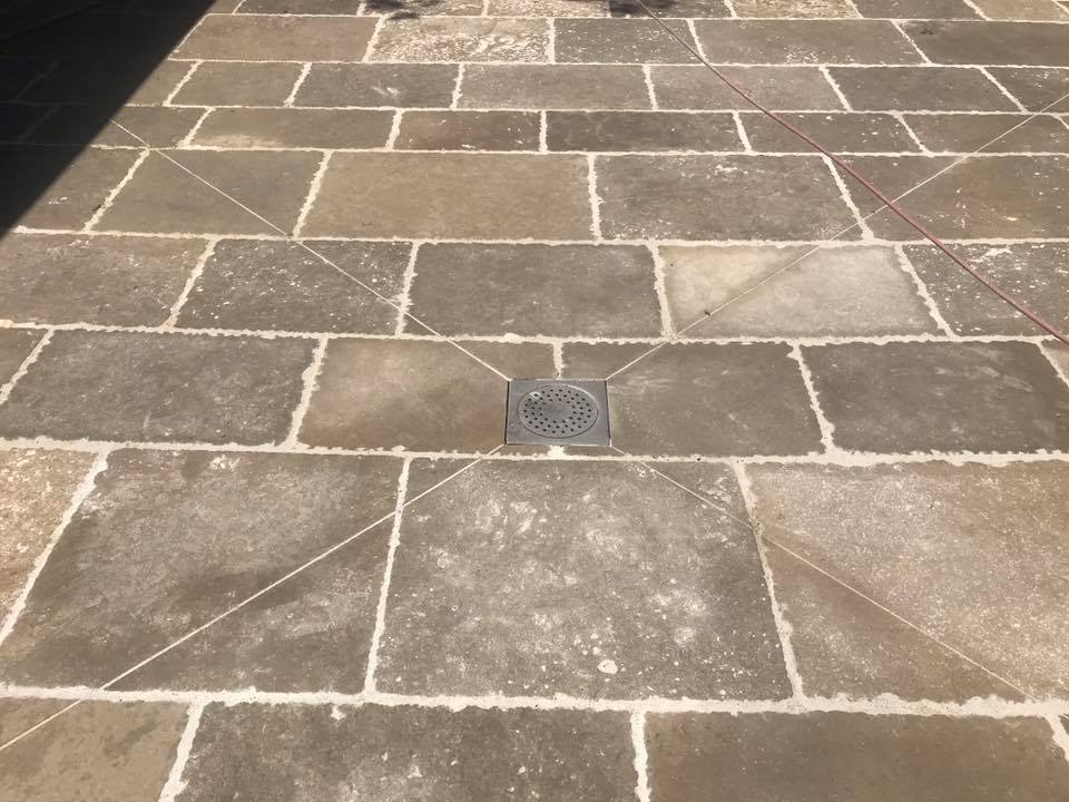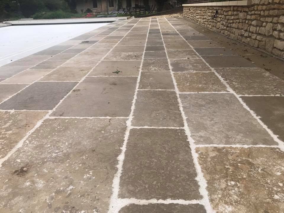 Description : Animer une terrasse articulée autour d’une piscine avec la pose de travertin. L’aspect authentique de la pierre se renforce par un travail subtil des joints ( couleur, aspect, largeur). Le calepinage des éléments multi formats dynamisent la surface. Une douche extérieure demandera la réalisation d’un siphon intégré avec formes de pentes (photo n°3)