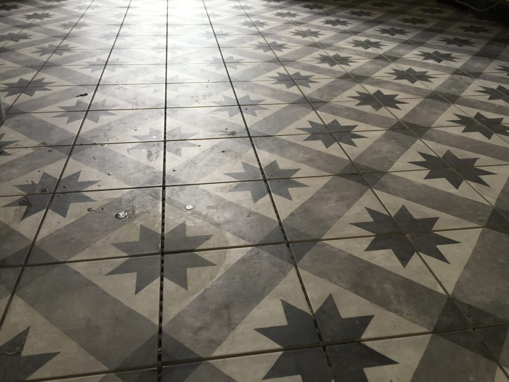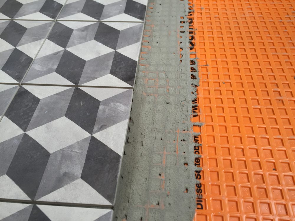 Description : Rénovation de sols avec pose d’un natte désolidarisante Schlüter Ditra . Obligatoire pour une bonne conformité de la pose de céramique sur un plancher bois, elle désolidarise les deux surfaces, absorbant les différentes déformations physiques liées aux caractères intrinsèques du bois.